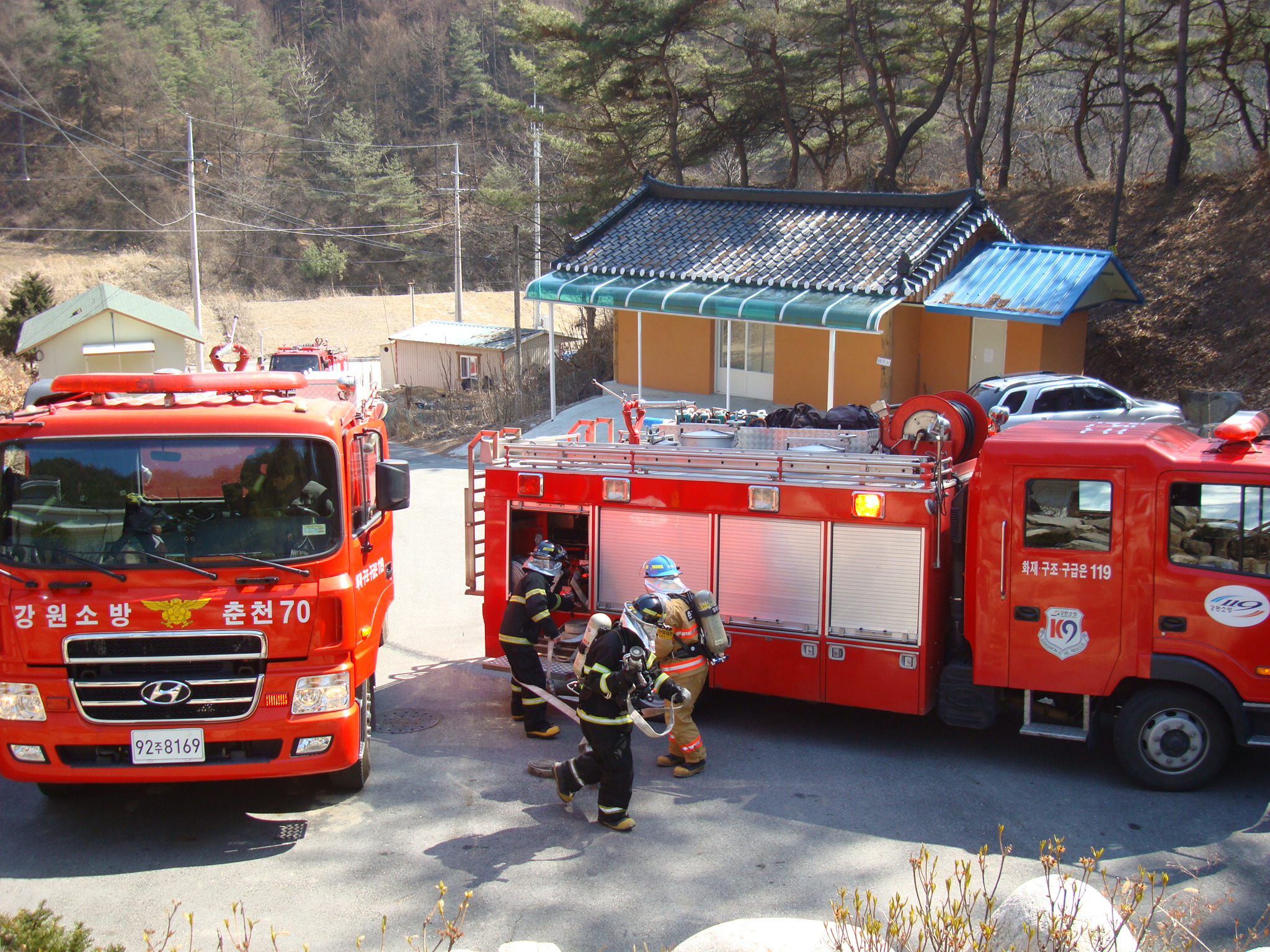 양구119안전센터(센터장 소방경 강경훈)에서는 3. 20(화) 13:30~ 14:50 심곡사 유관기관 합동소방훈련을 실시하였습니다. 양구군청, 경찰서, 국유림관리소, 심곡사 관계자 등 총 59명의 인력이 훈련에 참여하였고, 산불진화차, 경찰차, 소방차량등을 포함 6대가 훈련에 동원되었습니다. 산불발생시 연속확대 방지, 인명구조 및 대피훈련, 건축물 특성에 따른 주요 취약부분 및 진화방법 등에 대해 훈련 실시하였으며, 유관기관의 적극적인 협조로 원활히 훈련이 마무리 되었습니다. 양구119안전센터는 매 훈련 실질적인 효과를 거둘 수 있도록 항상 노력하겠습니다!!