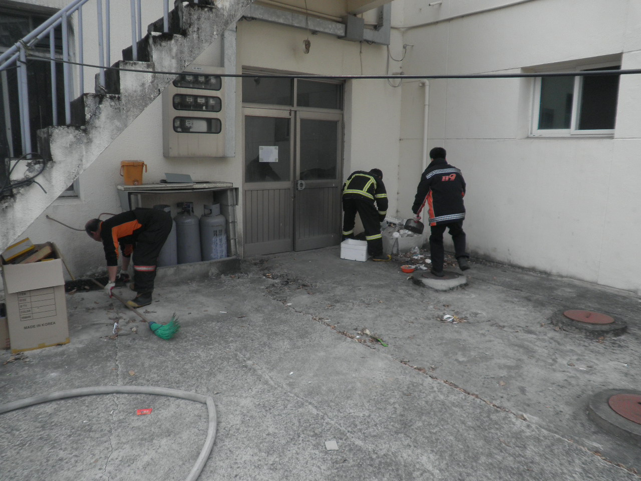 석사119안전센터(센터장 이봉춘)에서는 2012.03.22.(목) 국토 대청소의 날을 맞이하여 청사 및 청사 외곽 환경정리를 실시하였습니다. 주변의 담배꽁초 등 쓰레기를 쓸고 줍고 물청소를 실시하였습니다. 봄을 맞이하여 깨끗히 청소를 하고 나니 마음도 깨끗해지는 느낌입니다.!
