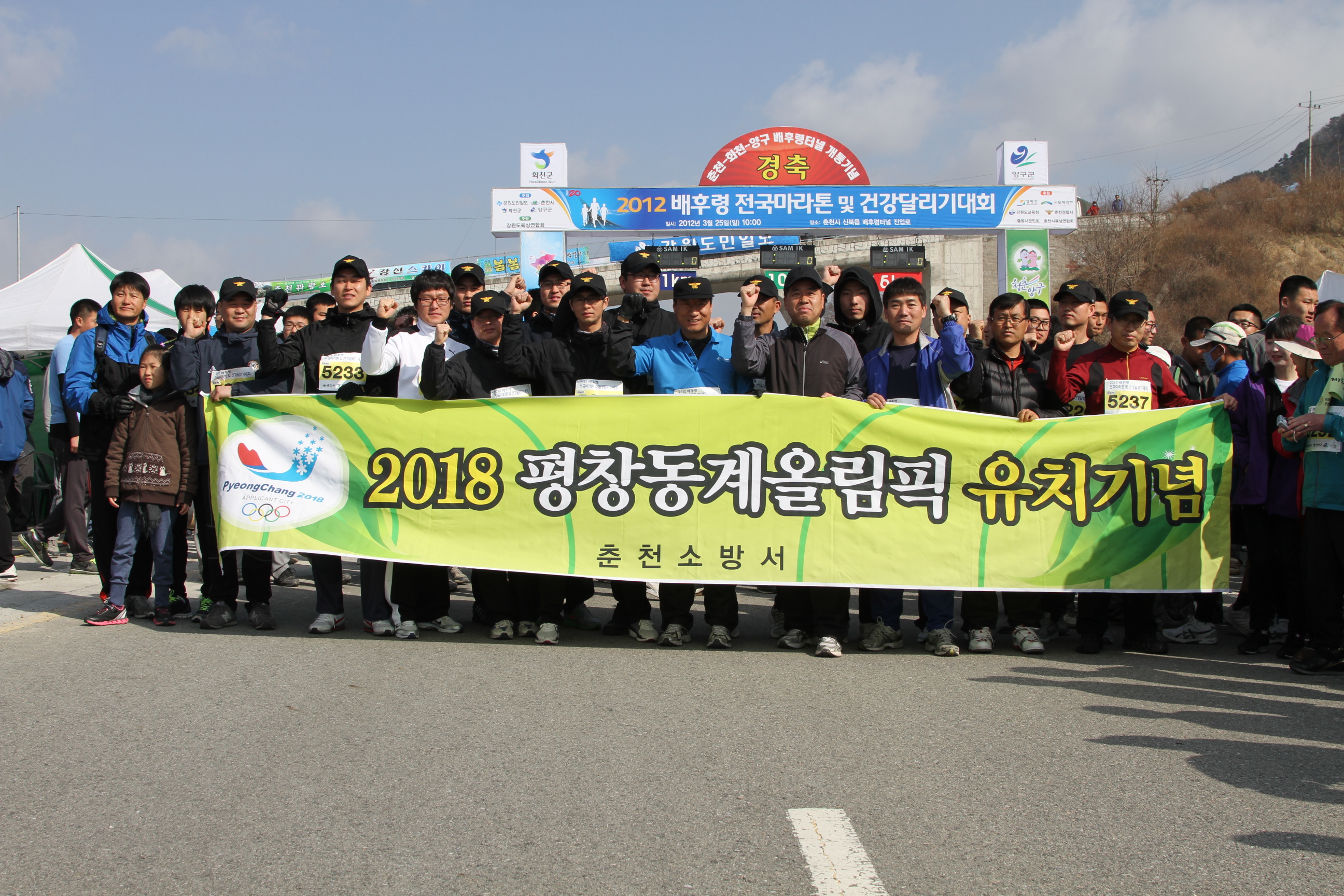 춘천소방서(서장 조완구)는 2012.03.25(일) 배후령 터널 준공을 축하하는 마라톤 및 건강달리기 대회에 참가하였습니다. 역사적인 배후령 터널의 개통을 축하하며 모두 함께 하나가 되어 달릴수 있는 뜻깊은 자리였습니다. 아울러 바쁘신 와중에도 함께 해주신 우원기 소방행정과장님께 감사의 말씀 드립니다.