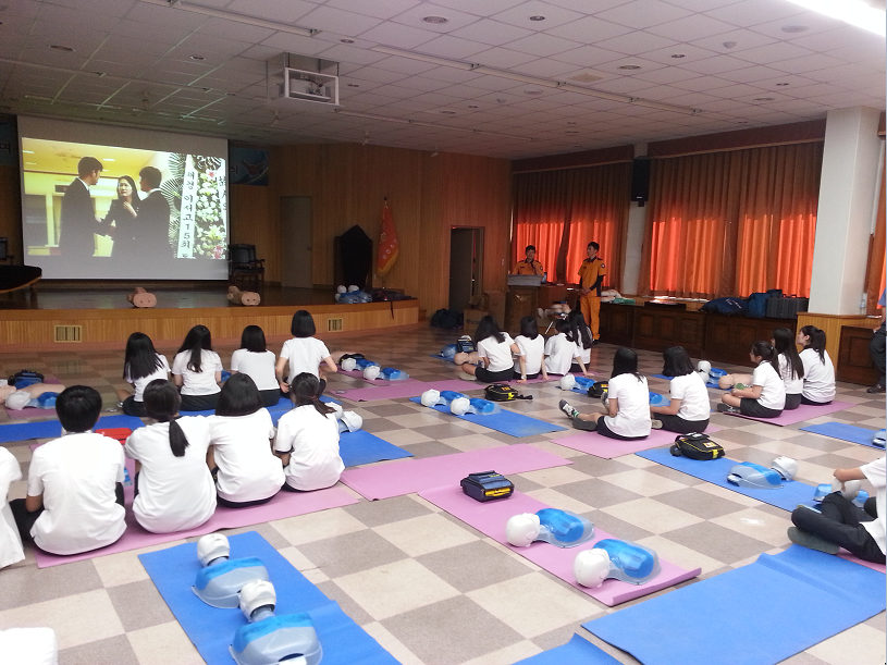 강원사대부설고등학교 한별단 45명(인솔교사2병)은 "꿈 찾기 멘토링" 미래소방관 직업체험교실 중 심폐소생술 체험 및 실습을 하고있다.