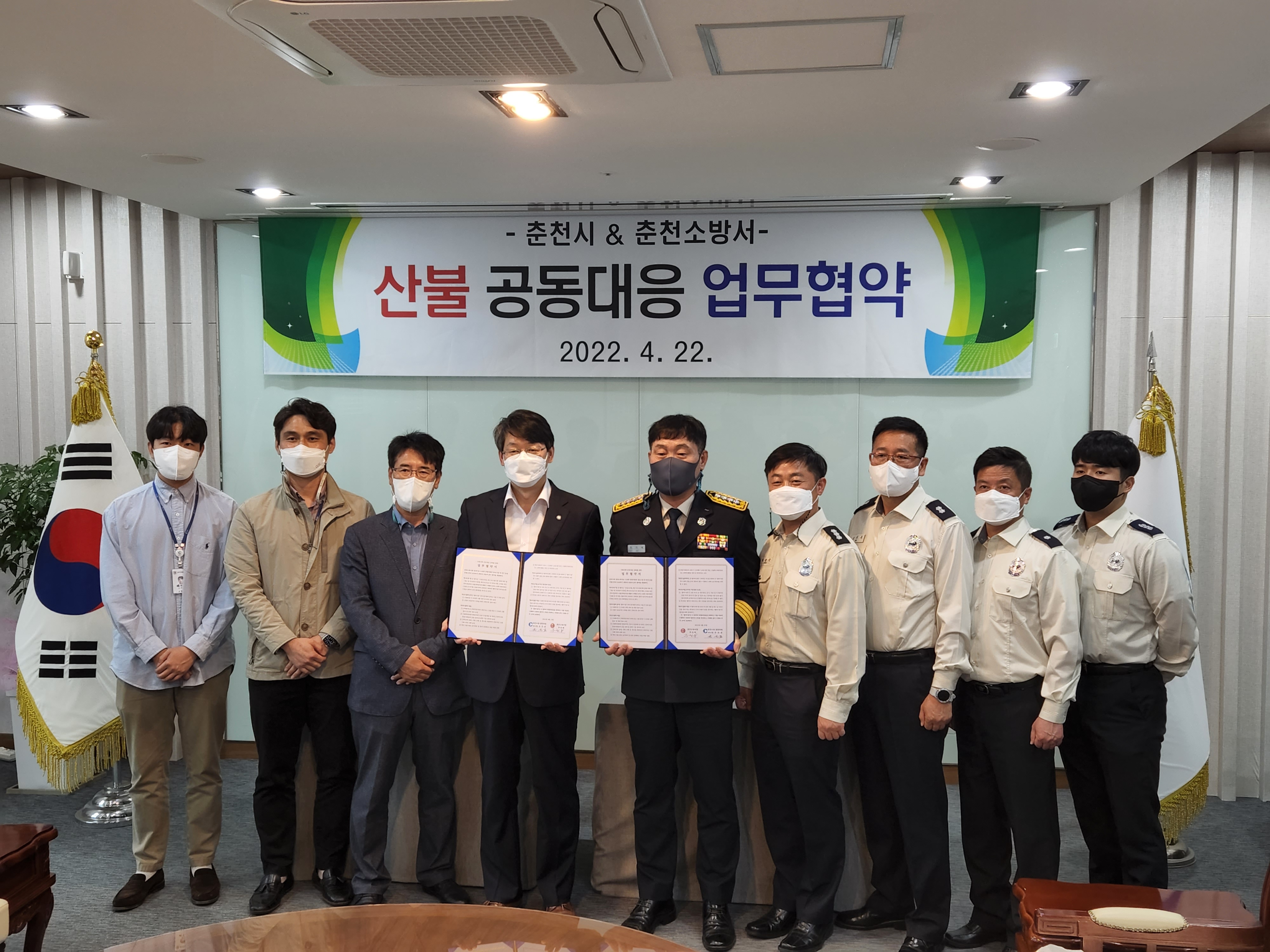 □ 춘천소방서(서장 주진복)는 지난 22일 오후 14시께 춘천시청 3층 접견실에서 춘천시청과 산불 공동대응 역량강화를 위한 업무협약을 체결했다고 밝혔다.