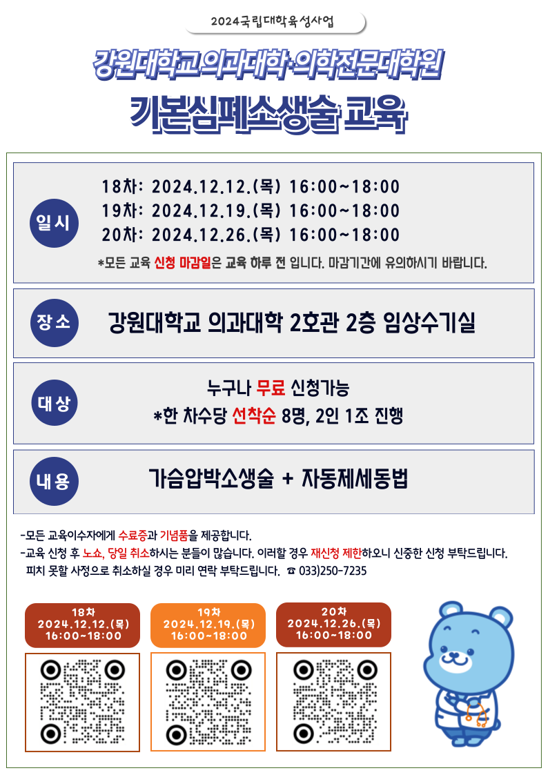 춘천 시민 대상 무료 심폐소생술 교육 안내 (강원대학교 주관)