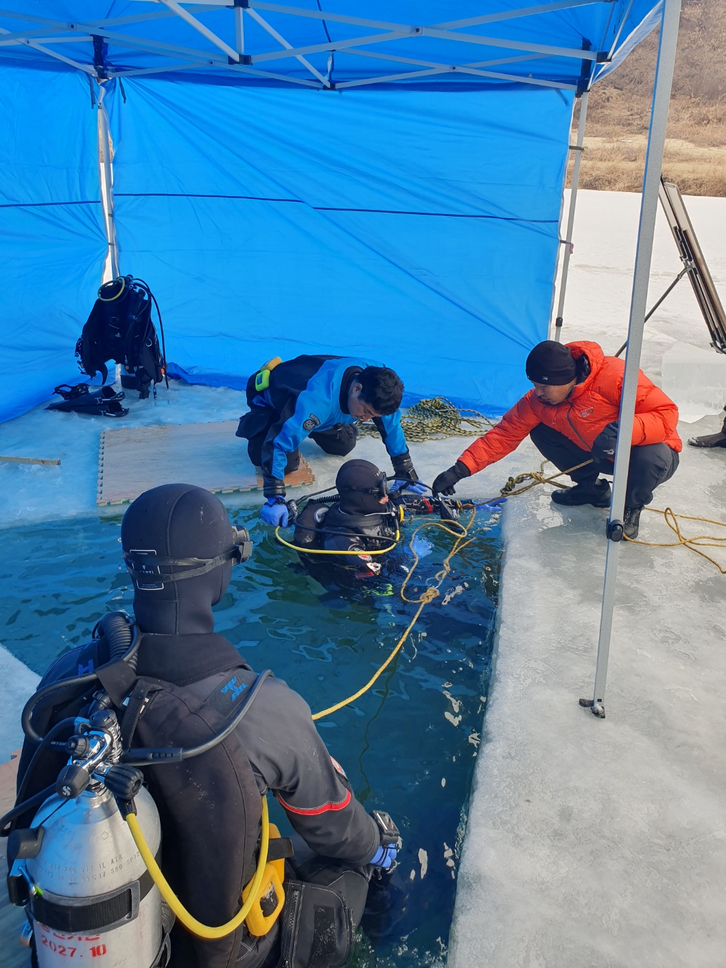훈련내용은 ▲얼음물 익수사고 구조를 위한 얼음제거 및 인양 ▲얼음제거 후 안전한 입·출수구 만들기 ▲잠수물리 이론 및 잠수장비 유지관리 방법 ▲수난구조장비 점검 및 사용법 숙지 ▲건식잠수복 적응 및 중성부력 유지 등 잠수기술 향상 훈련 ▲상황별 수중탐색법 훈련 및 익수자 구조훈련이다.