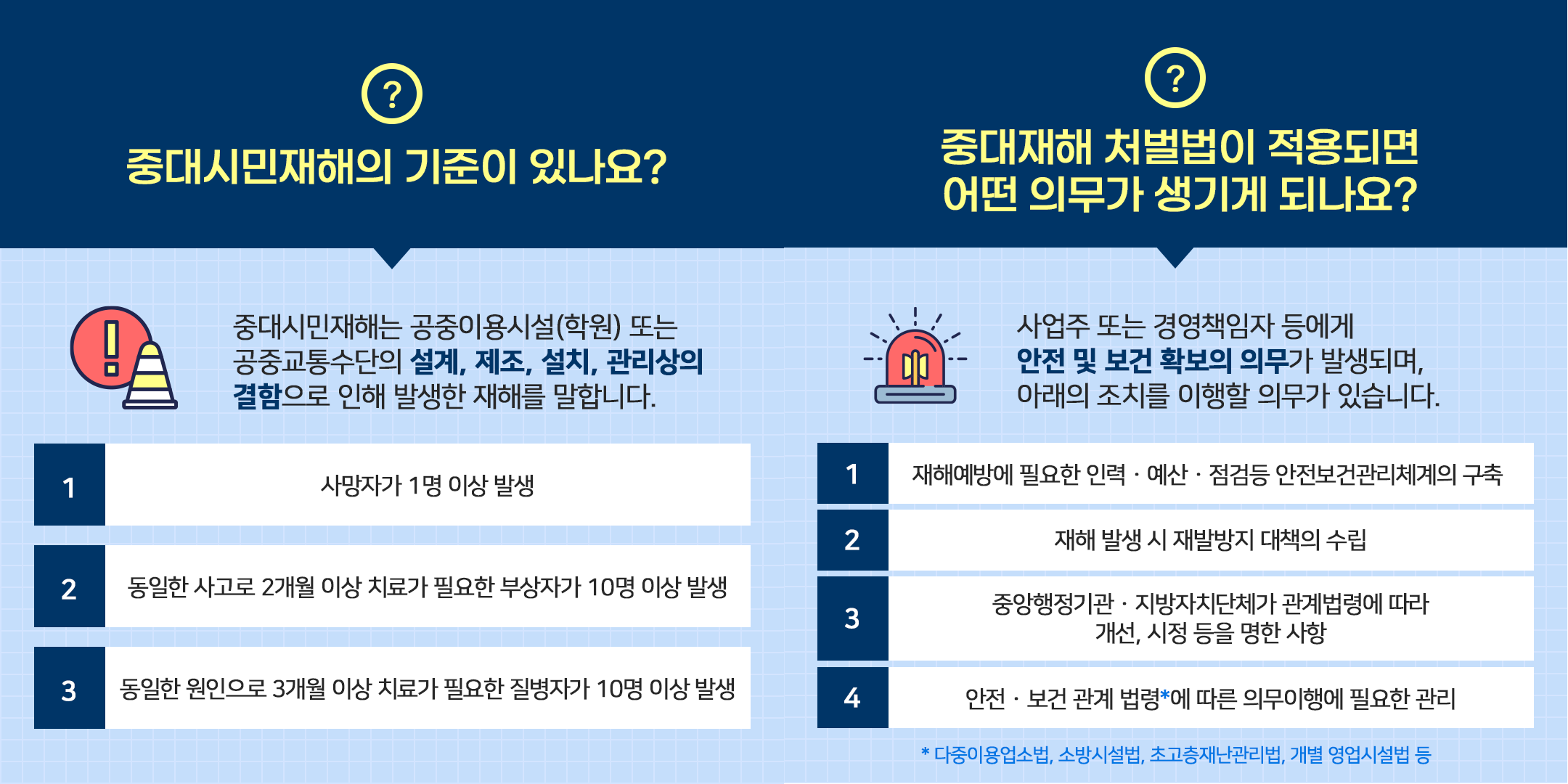 ○ 중대재해 발생 시 사고를 막기 위한 의무를 다하지 않은 사업주 또는 경영책임자 등을
