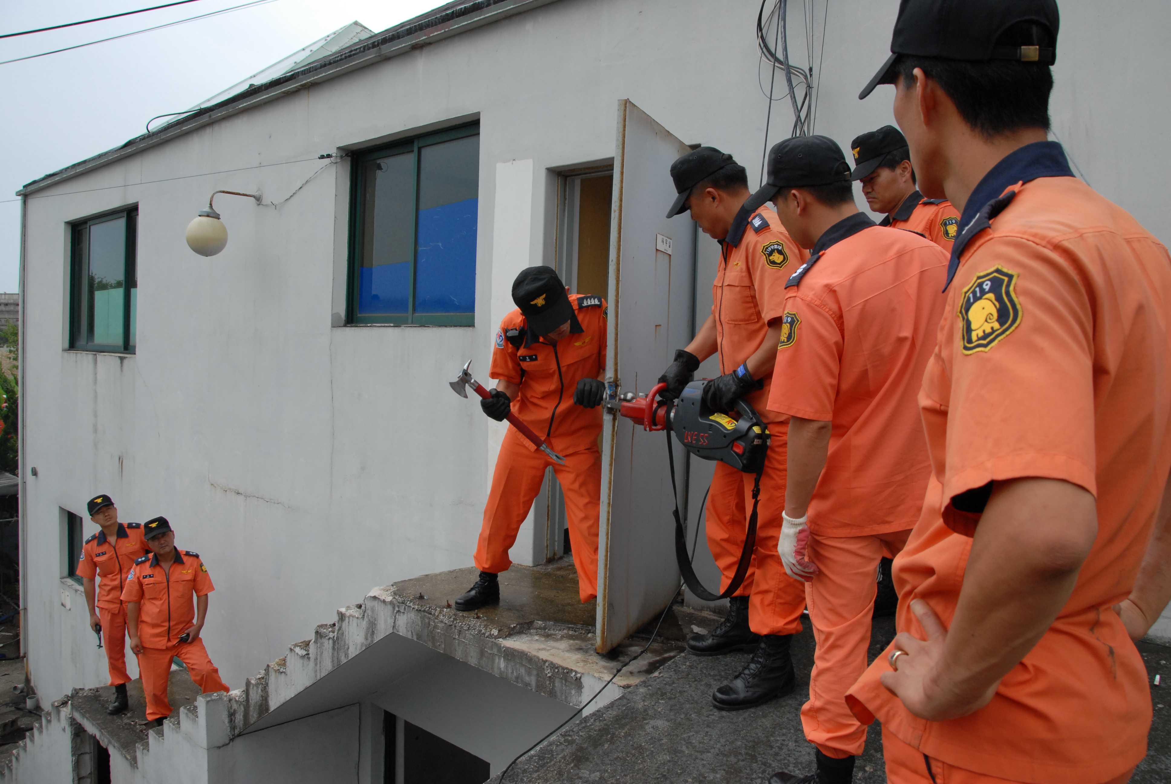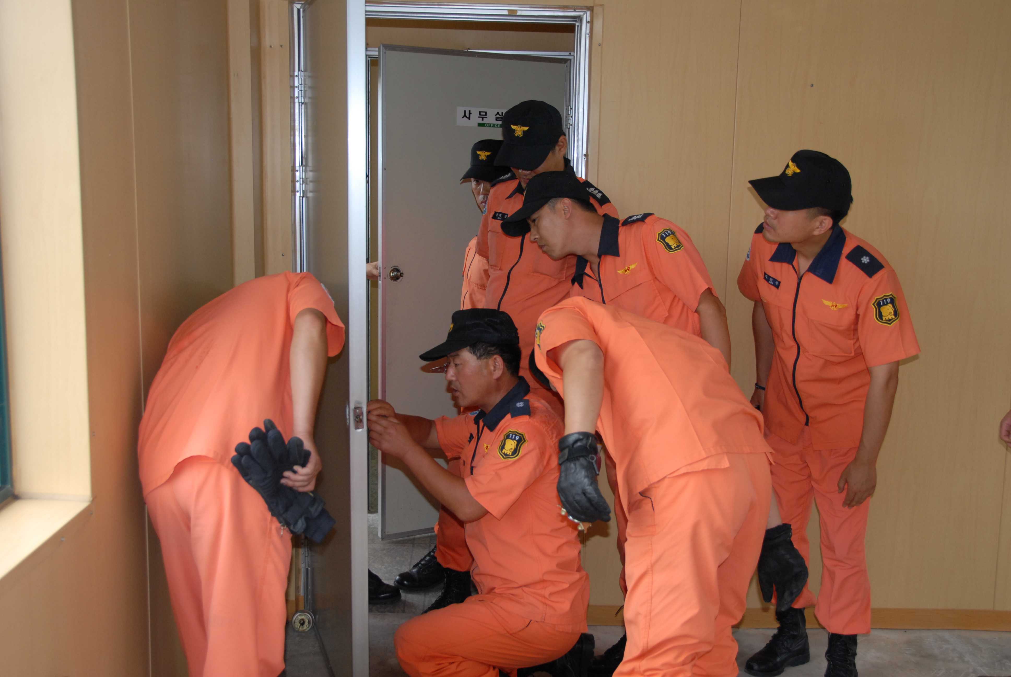 동해소방서에서는 2009.7.16~7.17(2일) 동안 119안전센터 및 구조대 소속 전직원에 대하여 철거 예정인 건물을 활용하여 디지털 도어록 등 현관문 개방(파괴) 요령 교육 및 훈련을 실시 하였습니다.