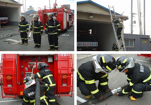 묵호안전센터는 2009년 하반기 현장활동 기본전술 숙달훈련 평가에 대비하여 화재진압조법, 공기호흡기 착용훈련 및 흡수관 조작훈련을 실시하였습니다.