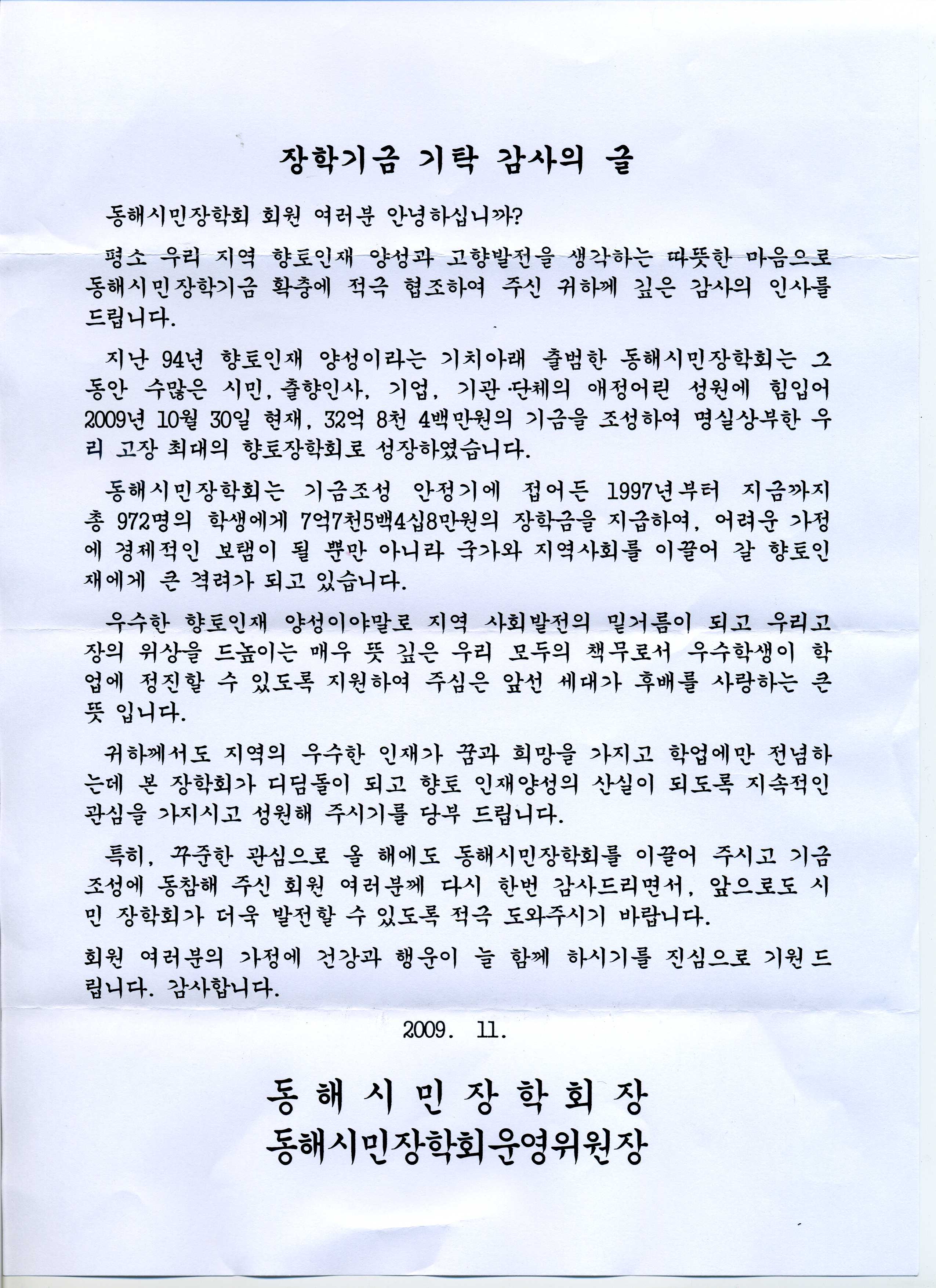 동해시민장학회 장학금 기탁 감사의 편지