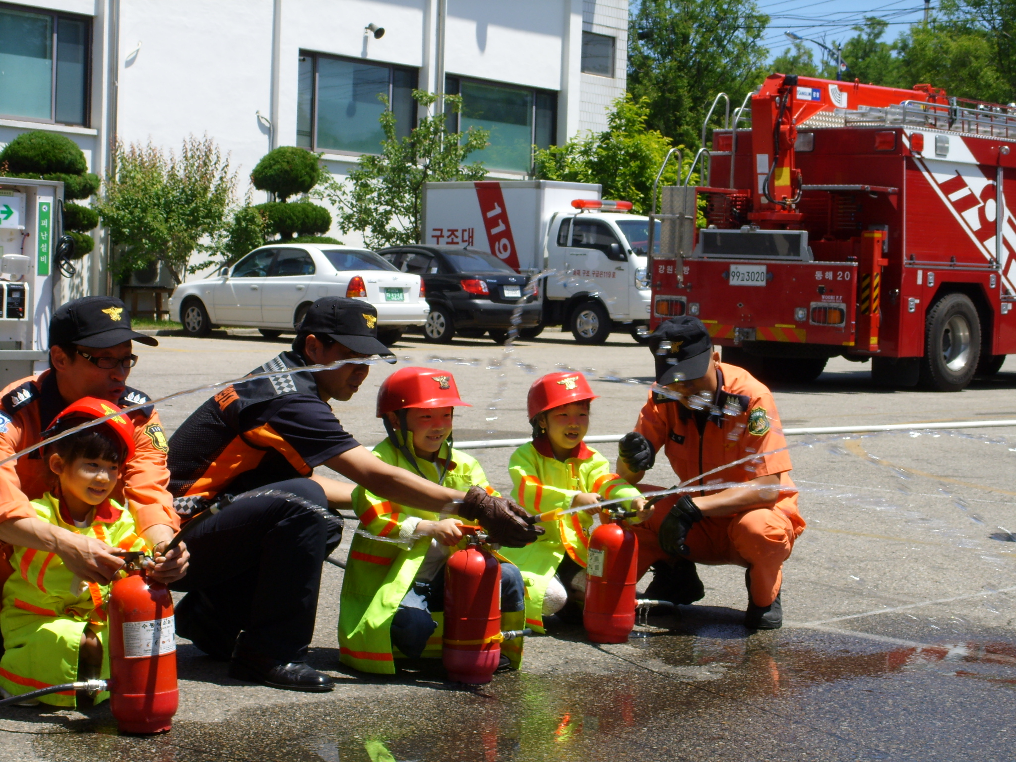 어린이들은 화재 시 대피요령, 119신고요령 등에 대하여 교육을 받은 후 물소화기 체험장 운영으로 소화기 사용법을 익히고, 소방차량 등 각종 구조?구급장비를 견학하는 시간을 가졌다.