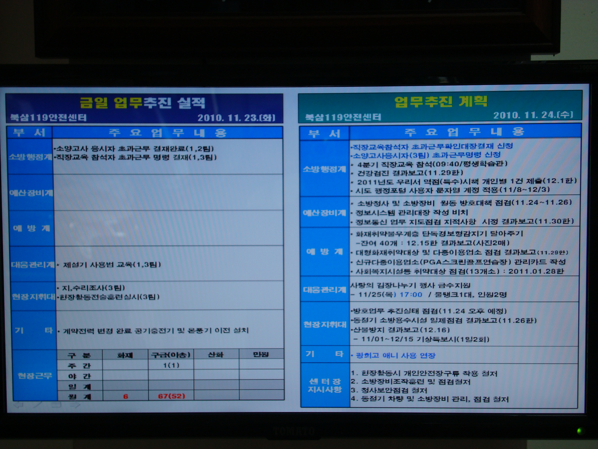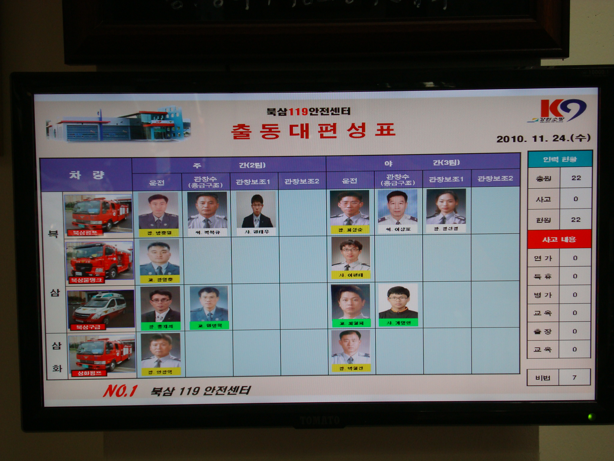 북삼119안전센터(센터장 전찬호)는 새롭게 개정된 강원도 소방공무원 근무지침에 따라 출동대편성표를 제작하여 운영하기시작하였다. 벽걸이 모니터와 파워포인트를 이용하여 출동대편성표 외에 일일업무보고 및 공지사항 등을 직원들에게 전달하는데 이용할 계획이다.