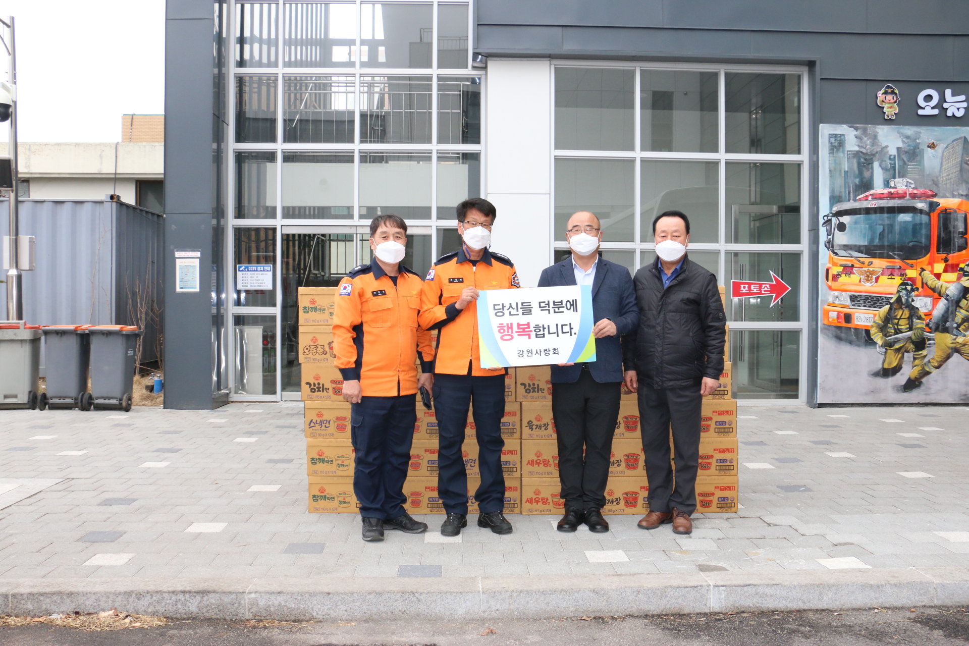 강원사랑회(사무국장 이호외 3명)는 3월 15일(화) 14:30분 동해소방서를 방문 동해안 산불 진화 활동의 노고를 격려하고 위문품으로 라면 96박스를 전달하였다.