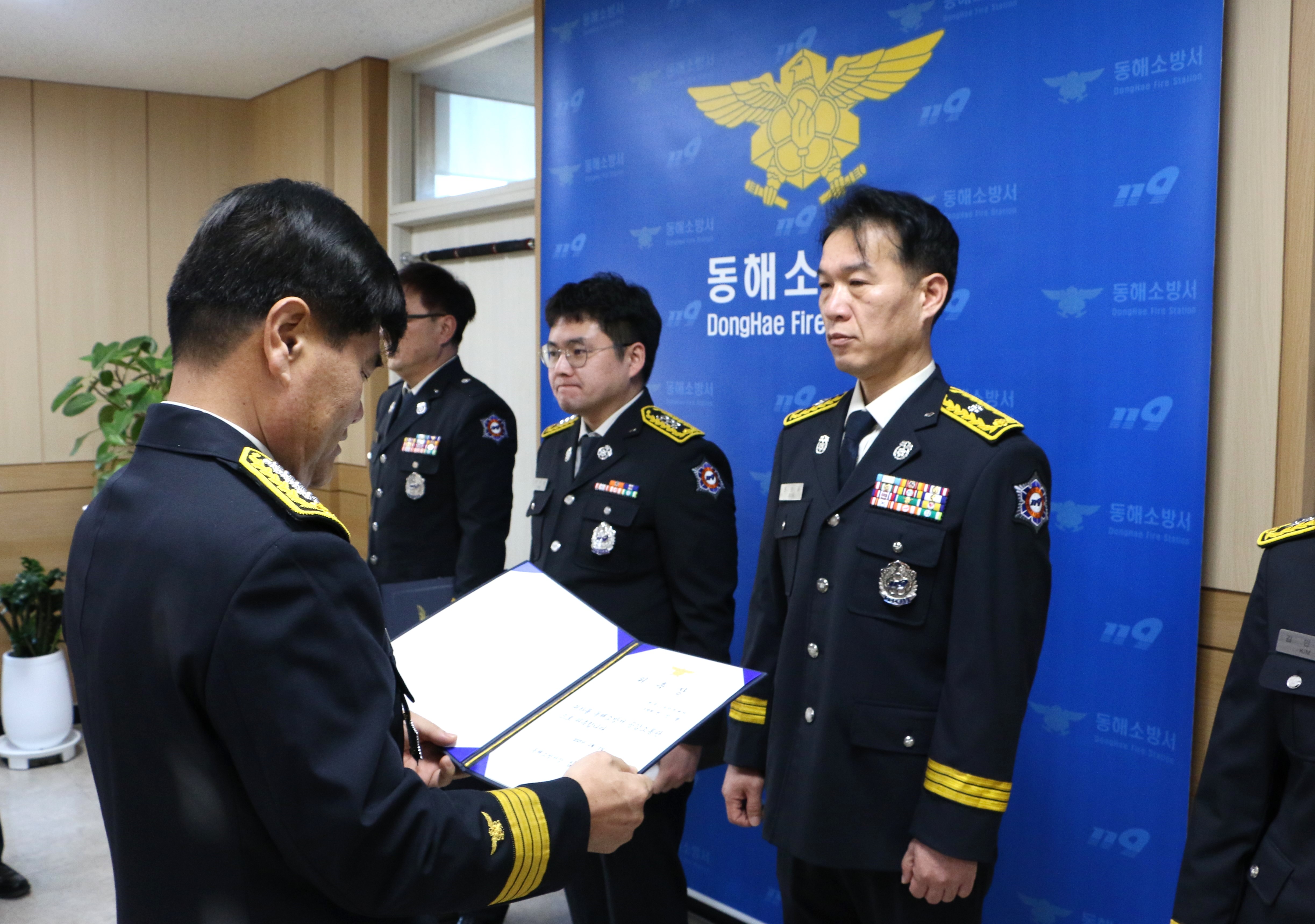 동해소방서(서장 심규삼)는 3일 서장실에서‘2025년 상반기 동해소방서 으뜸소방관’선정 수여식을 열고, 평소 솔선수범하며 동료들에게 귀감이 된 소방행정과 소속 소방교 박병일을 으뜸소방관으로 선정했다.