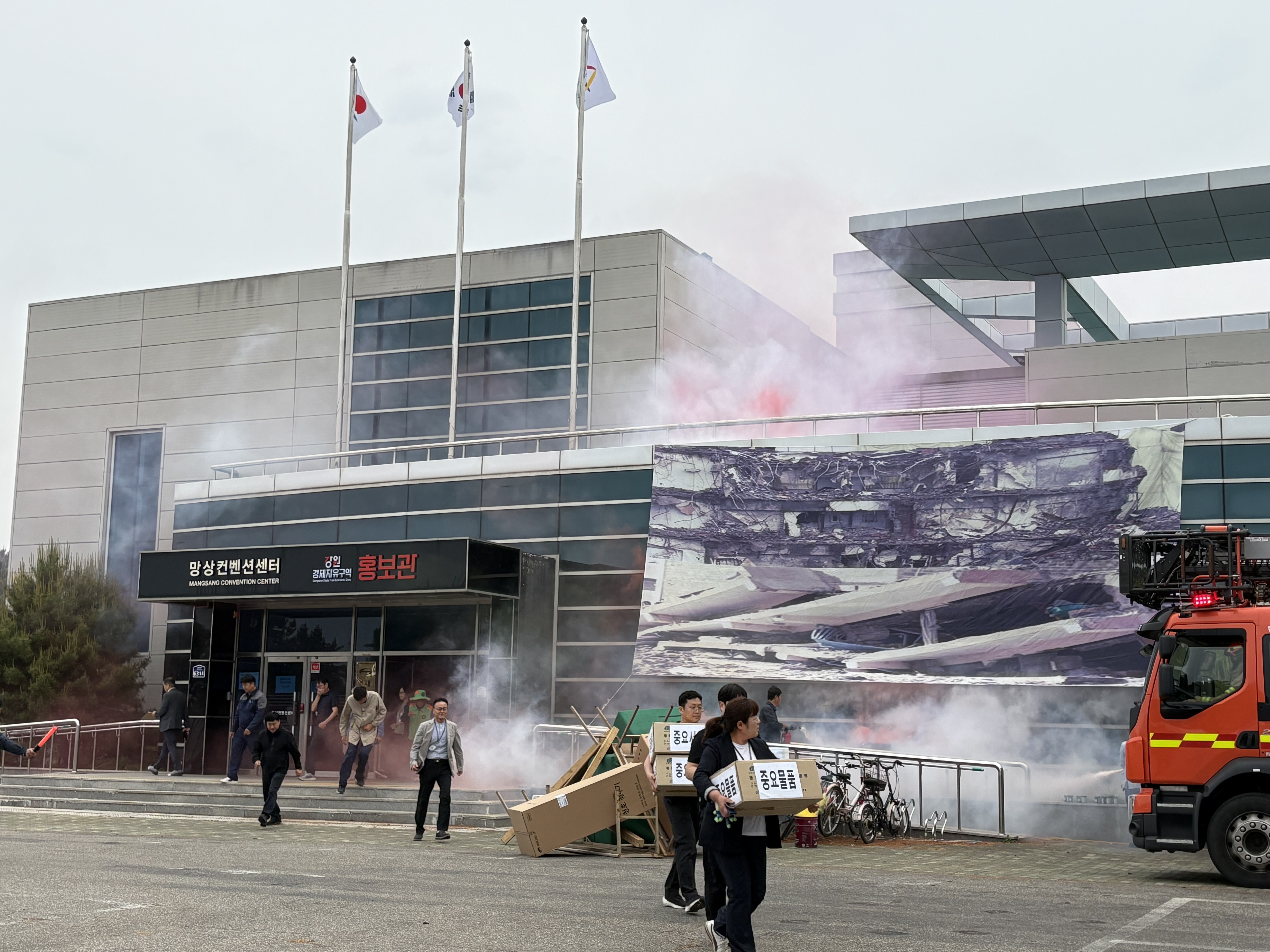 훈련은 오후 2시경 지진으로 인해 망상컨벤션센터 건물이 일부 붕괴되고, 이로 인해 대형 화재가 발생하며 행사 참석자 다수가 사상자로 이어지는 복합재난 상황을 가정해 진행됐다.