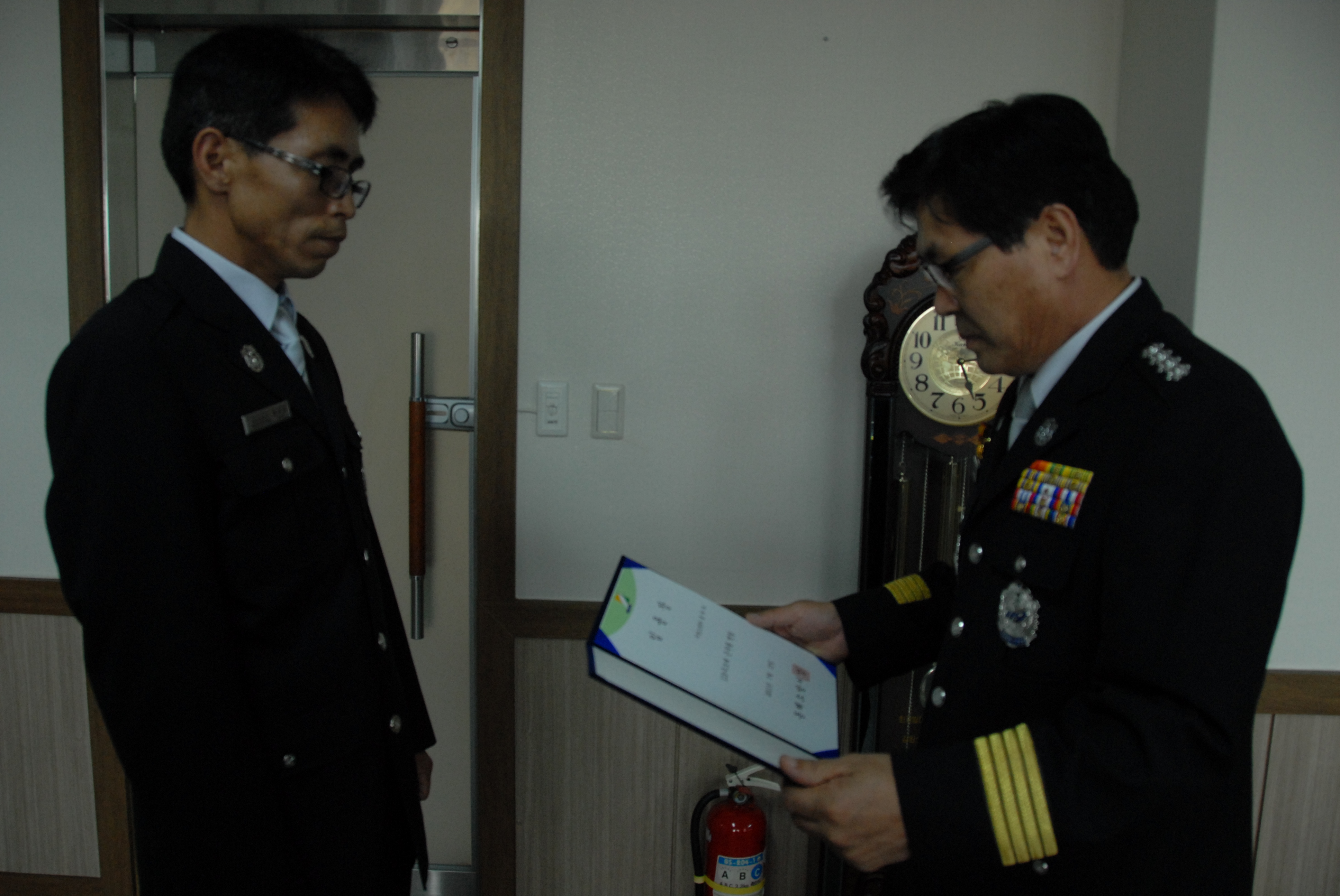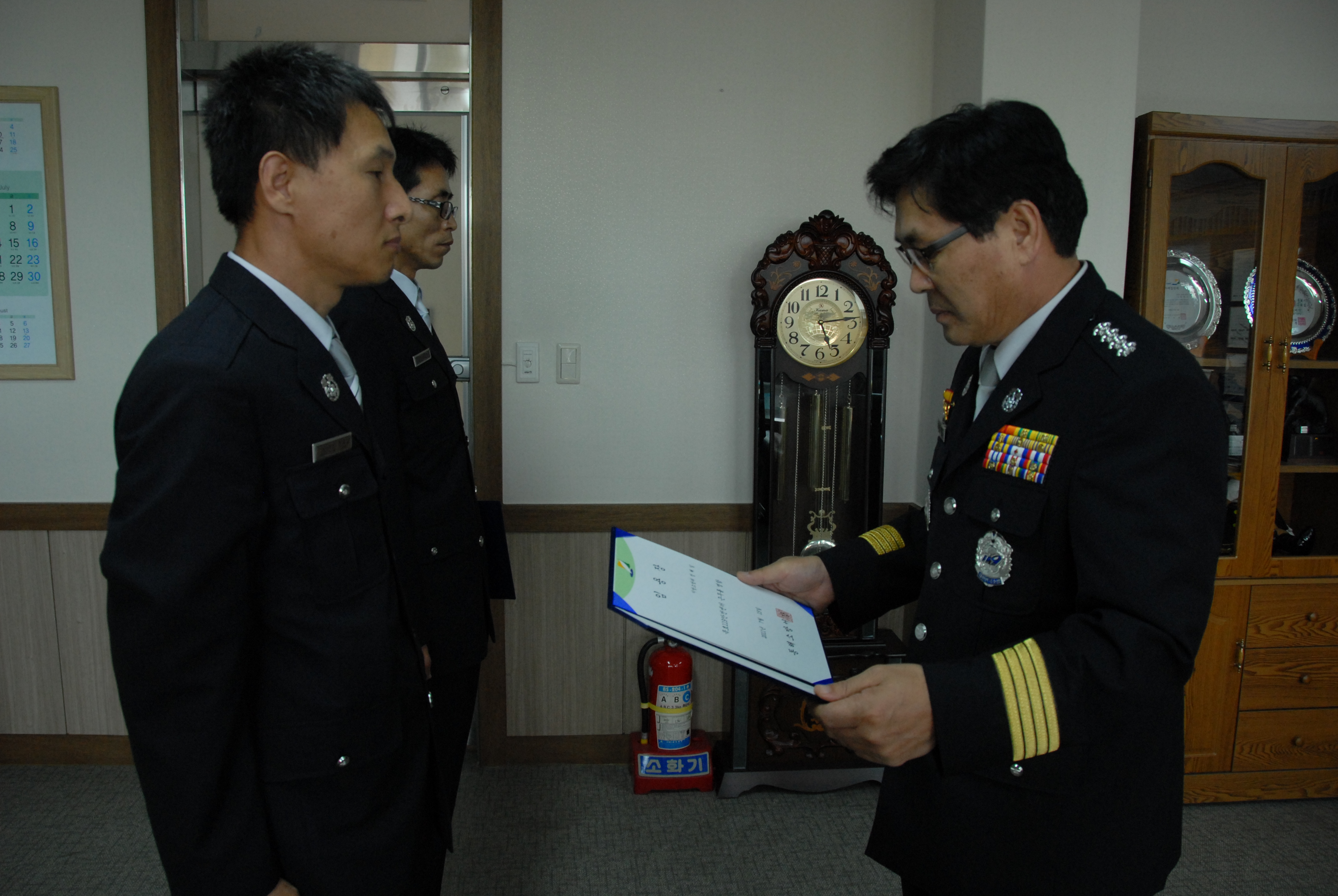 동해소방서 (서장 김남숙) 에서는 2011.07.15일 소방위로 승진한 홍재의,정해일에게 임용장을 수여하고 있읍니다.