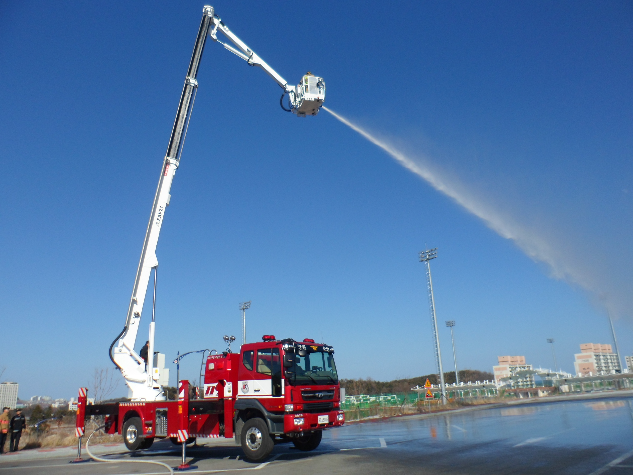 동해소방서(서장 김남백)는 2월 20일 14:30경 동해체육관 공터에서 굴절사다리차 방수포 조작훈련을 실시하였다.