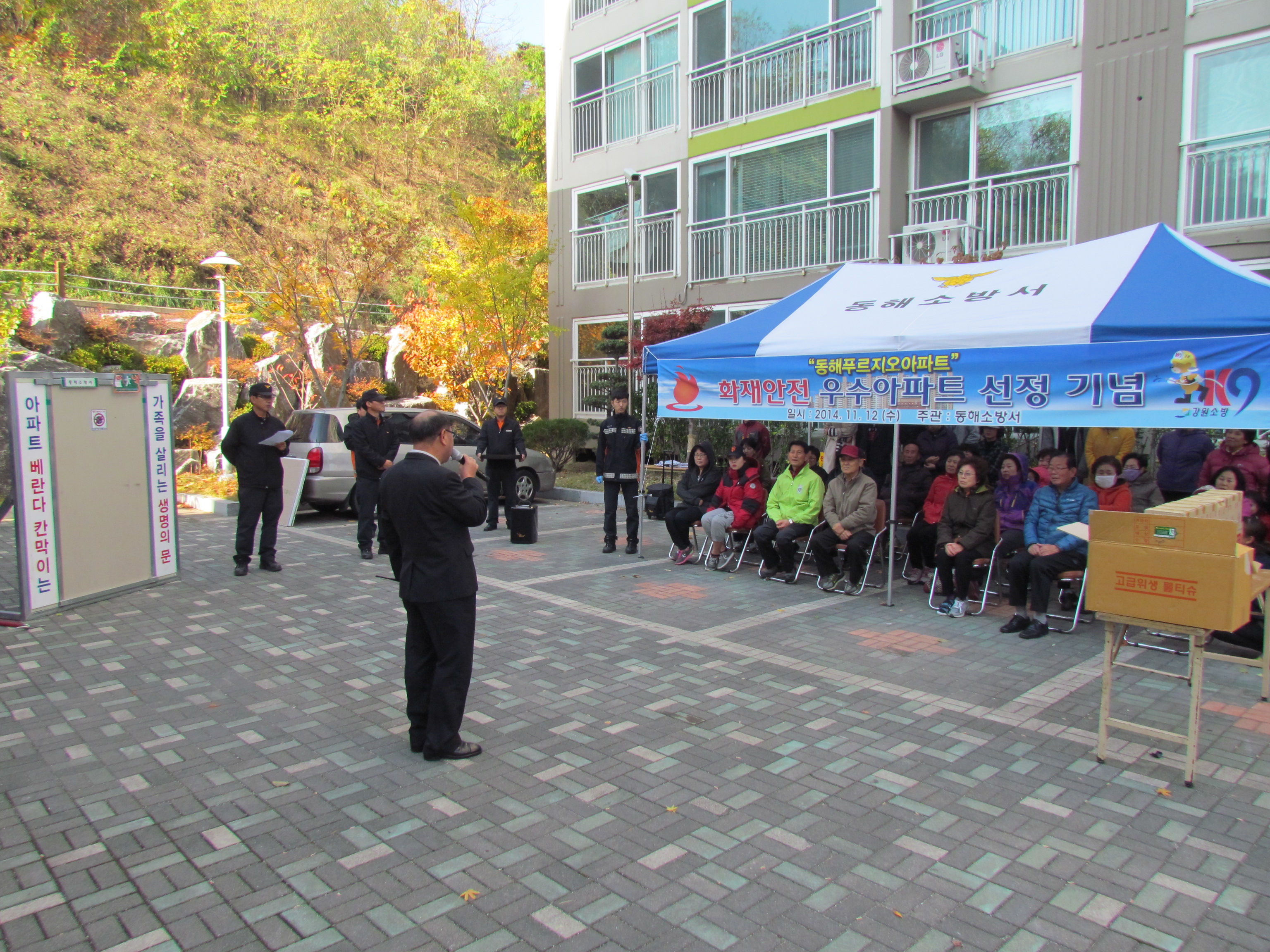 동해소방서(서장 주항중)는 12일(화) 오전11시 천곡동 소재 동해푸르지오아파트에서 소방공무원 및 아파트 주민 40명이 참여한 가운데 화재안전 우수아파트 선정 기념행사를 가졌다.