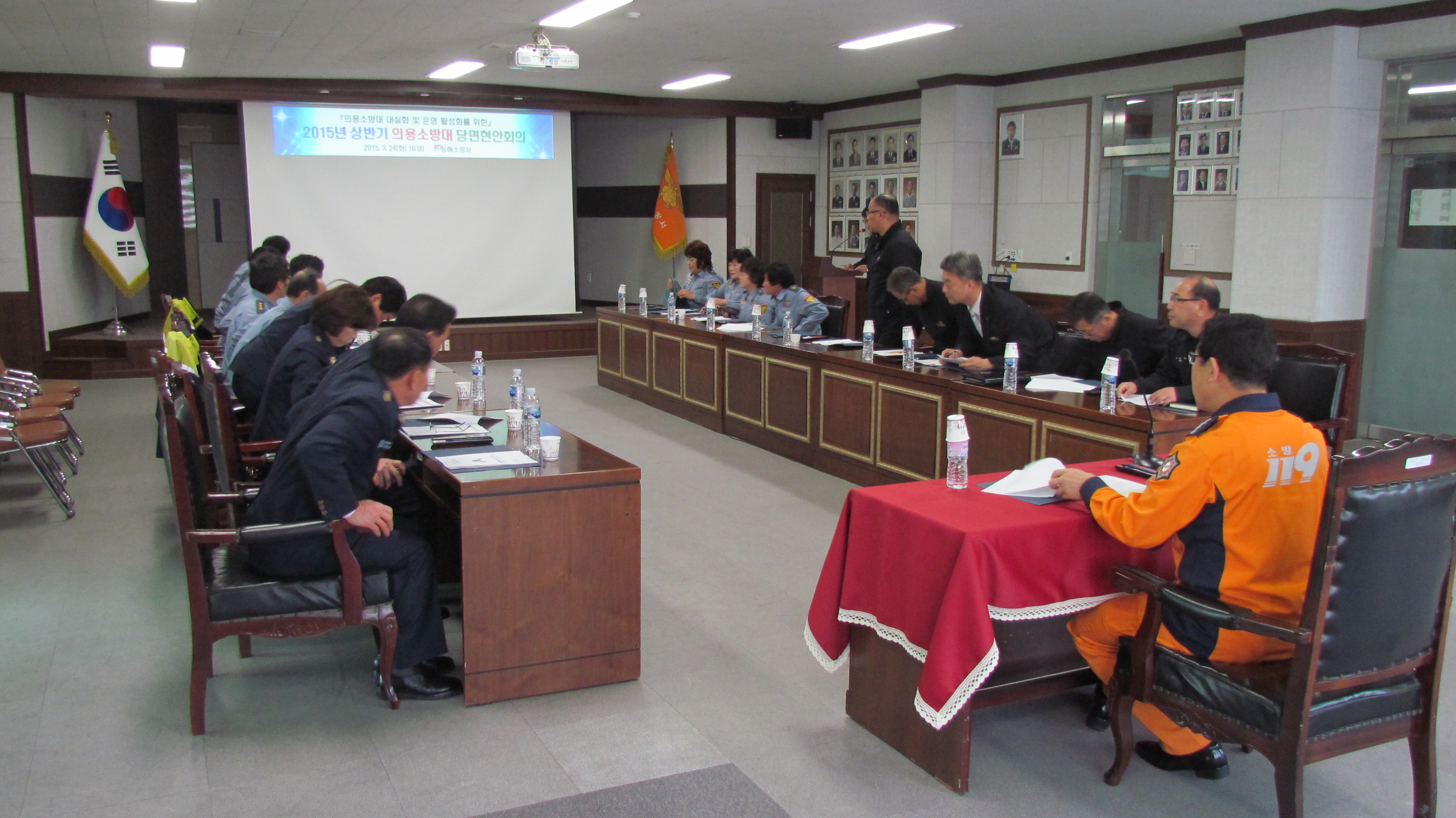동해소방서(서장 주항중)는 24일(화) 16시 소방서 2층 대회의실에서 관내 의용소방대 대장, 부대장을 비롯하여 소방서 관계자등 30여명이 참석한 가운데‘2015년 상반기 의용소방대 간담회’를 개최했다