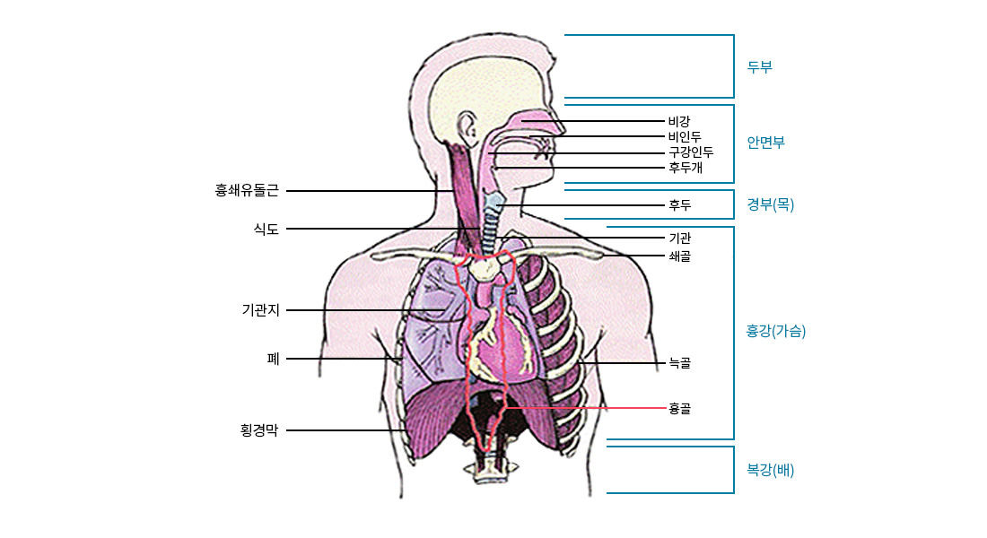 - 흉강의 바깥은 늑골과 흉골로 둘러 싸여 뼈로서 위쪽의 흉골병,중간의 흉골체,아래의 뽀족한 검상돌기로 구분할 수 있다. 늑골은 흉추와 흉골을 잇는 12쌍의 긴뼈로서 흉벽의 바깥벽을 이룬다. 흉강은 늑골과 위쪽의 쇄골,아래의 횡경막으로 막혀지며 전체가 2겹의 늑막에 싸여진다. 호흡계는 구강 및 비상, 인두,후두,기관,기관지,기관세지,폐 등으로 구성되는데 폐는 산소를 공급하고 이산화탄소를 제거하여 나머지는 공기의 통로가 된다. 늑골사이의 근육과 횡격막의 움직임으로 코와 입을 통해 들어온 공기는 후두를 거친뒤 후두개와 성문을 통하여 기관지로 들어간다. 기관은 ‘아담의 사과'라고 일컬어지는 갑상연골과 아래의 윤상연골이 같은 연골로 보호되는데 이곳으로 유입된 공기는 2개의 기관지를 통해 폐포에 닿게된다. 양쪽 폐 사이에는 종격동이 있어 심장과 큰 혈관들이 놓여진다. 심장은 근육으로 된 원추 모양의 장기로서 혈액을 순환시키는데 앞쪽에는 흉골이 뒤에는 흉추가 있으며,횡격막 위에 얹혀져 있다. 대동맥은 심장의 좌심실에서 나와 산소가 많은 혈액을 신체 각 부위에 보낸다.