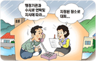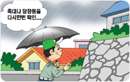 - 집 안팎의 하수구는 물론 배수구의 막힌 곳을 정비하고, 오래된 축대,담장은 넘어질 우려가 없는지 미리 정비하 고 위험한 곳은 표지판을 설치합시다.