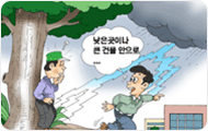 - 천둥이나 번개가 칠때는 우산을 쓰지말고 전신주, 큰 나무 밑은 피하여 낮은 곳으로 가거나 큰 건물 안으로 대피하고