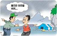 - 물에 잠긴 도로는 가급적 피하고 조그만 개울이라도 건너지 말고 안전한 도로를 이용합시다.