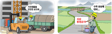 - 작업을 중지하고 떠내려 가거나 파손될 우려가 있는 기자재들은 안전한 곳으로 옮기도록 하고