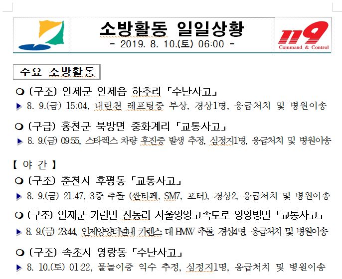 소방활동 일일상황(8. 10. 토) 06:00
