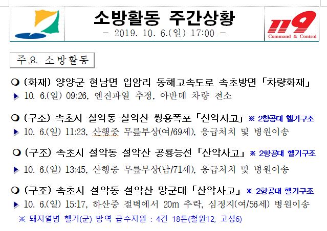 소방활동 주간상황 (10. 6. 일) 17:00