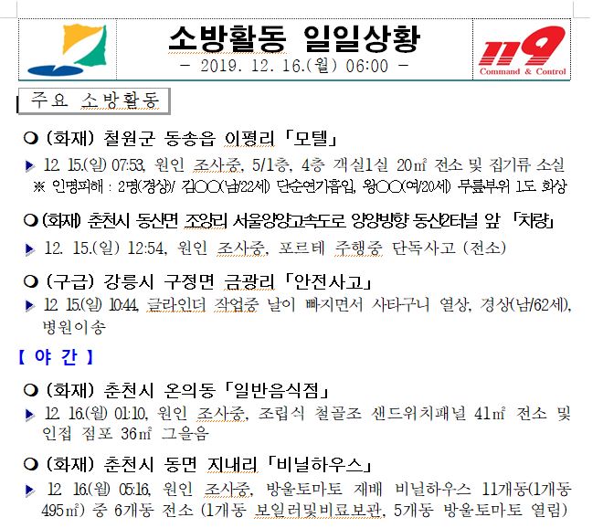 소방활동 일일상황 (12. 16. 월) 06:00