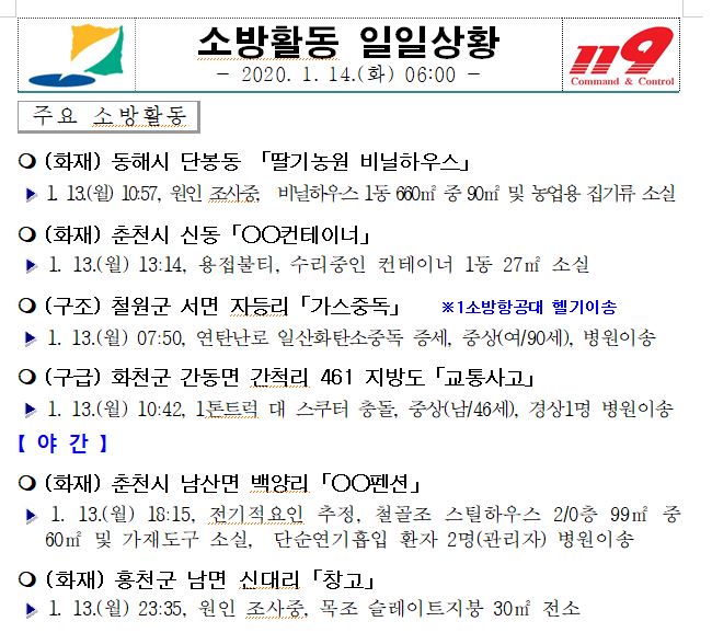 소방활동 일일상황 (1. 14. 화) 06:00