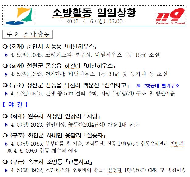소방활동 일일상황 (4. 6. 월) 06:00