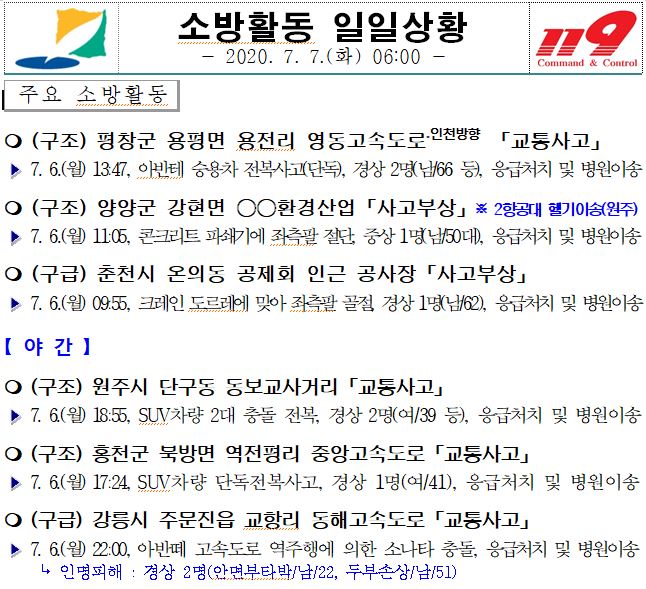 소방활동 일일상황 (7. 7. 화) 06:00