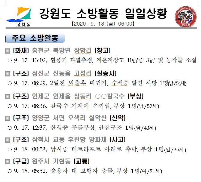 소방활동 일일상황(9. 18. 금) 06:00
