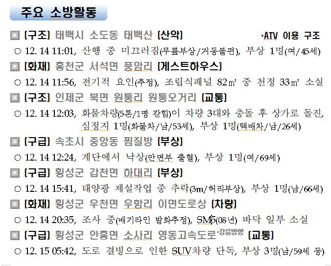 강원도 소방활동 일일상황(12. 15. 화) 06:00