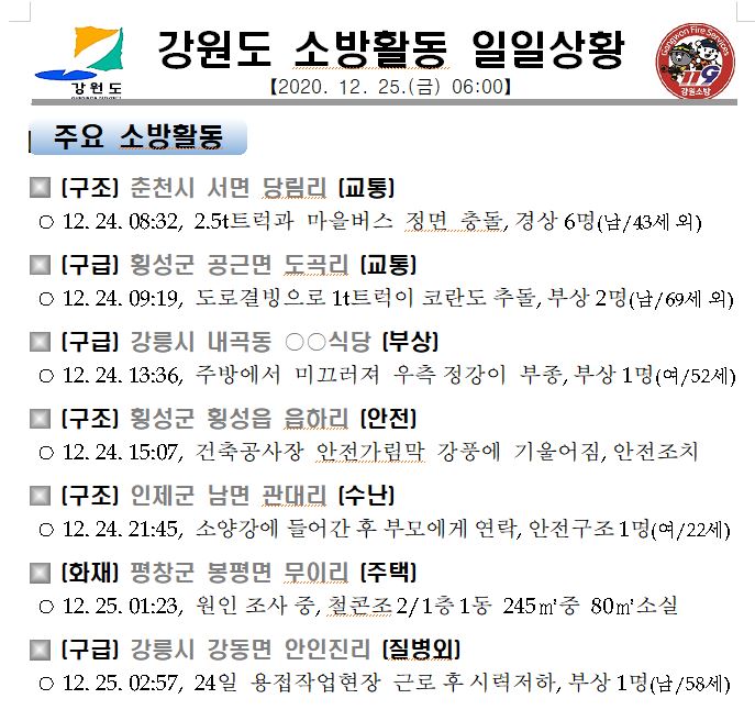 강원도 소방활동 일일상황(12. 25.금) 06:00