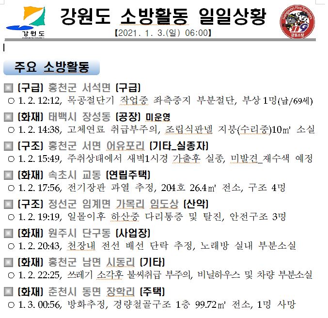 강원도 소방활동 일일상황(1. 3. 일) 06:00