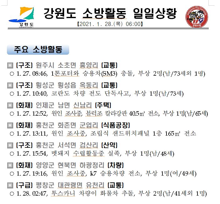 강원도 소방활동 일일상황(1. 28. 목) 06:00