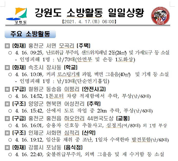 강원도 소방활동 일일상황(4. 17. 토) 06:00