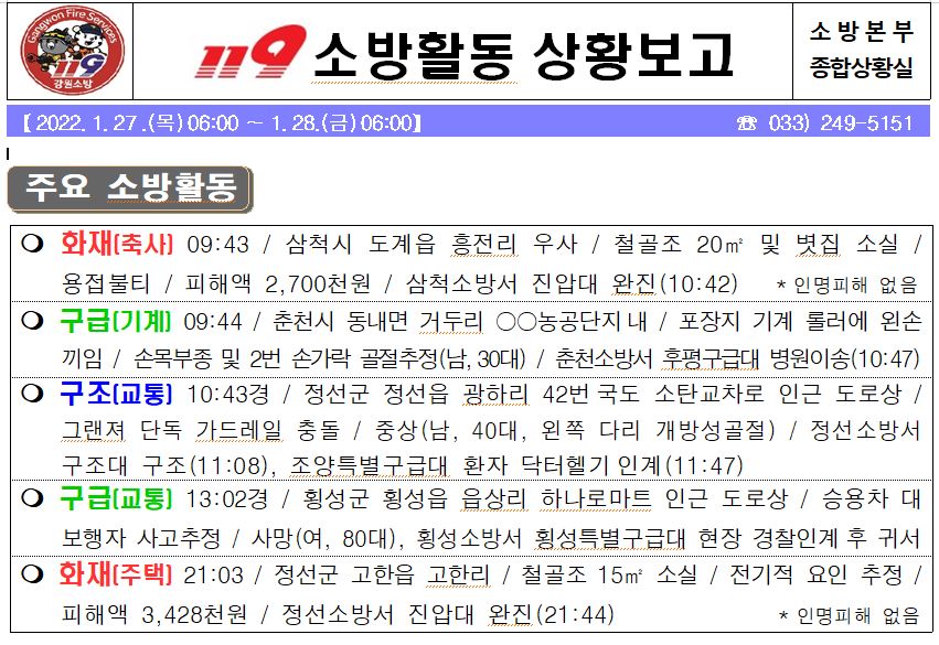 119 소방활동 상황 보고(1. 27. 목) 17:00