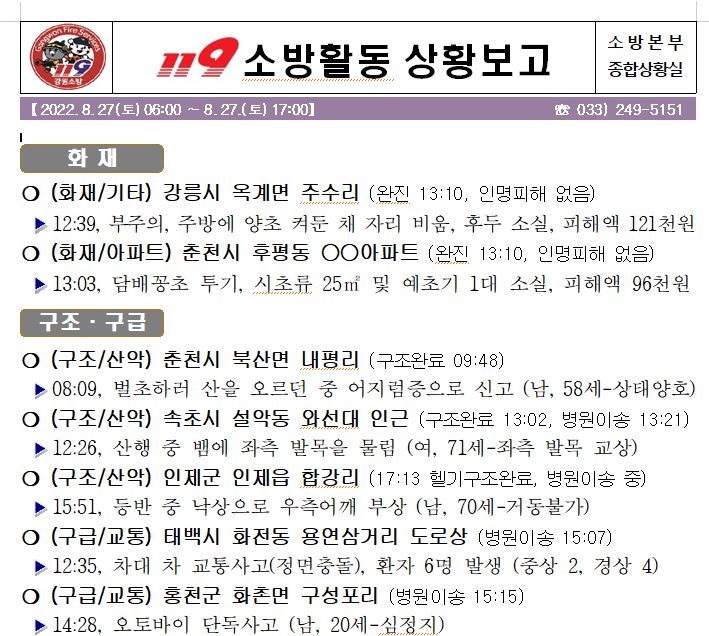 119 소방활동 상황보고(8. 27. 토) 06:00