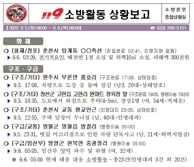 119 소방활동 상황보고(9. 6. 화) 06:00 및 태풍대응활동 사진