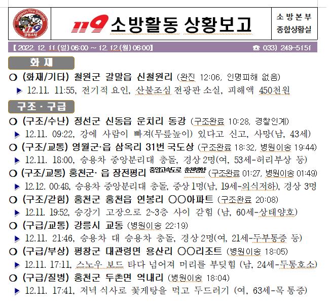 119 소방활동 상황보고(12. 12. 월) 06:00