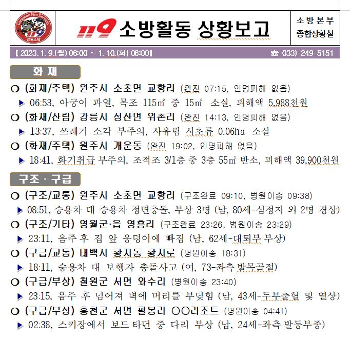 119 소방활동 상황보고(1. 10. 화) 06:00