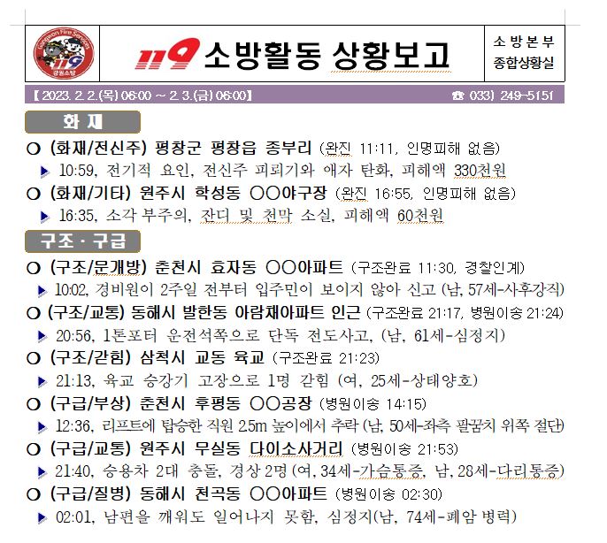 119 소방활동 상황보고(2. 3. 금) 06:00