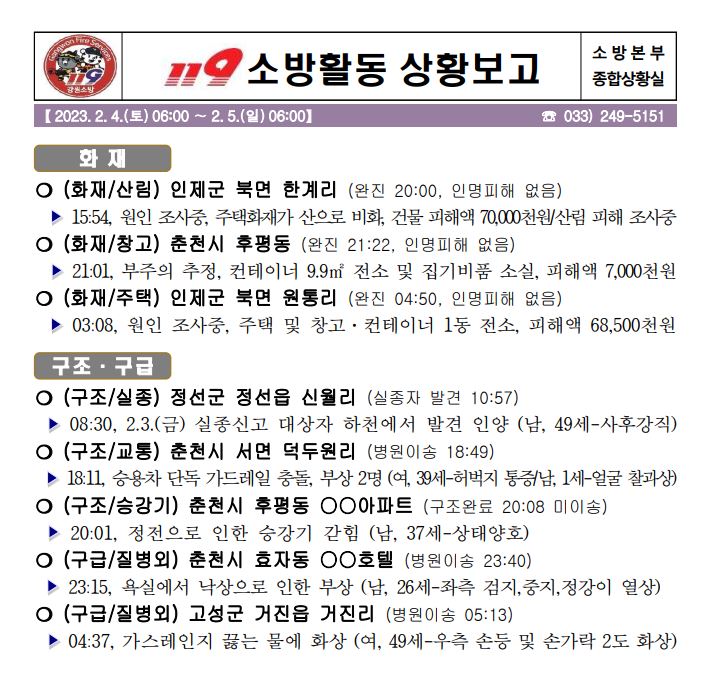 119 소방활동 상황보고(2. 5. 일) 06:00