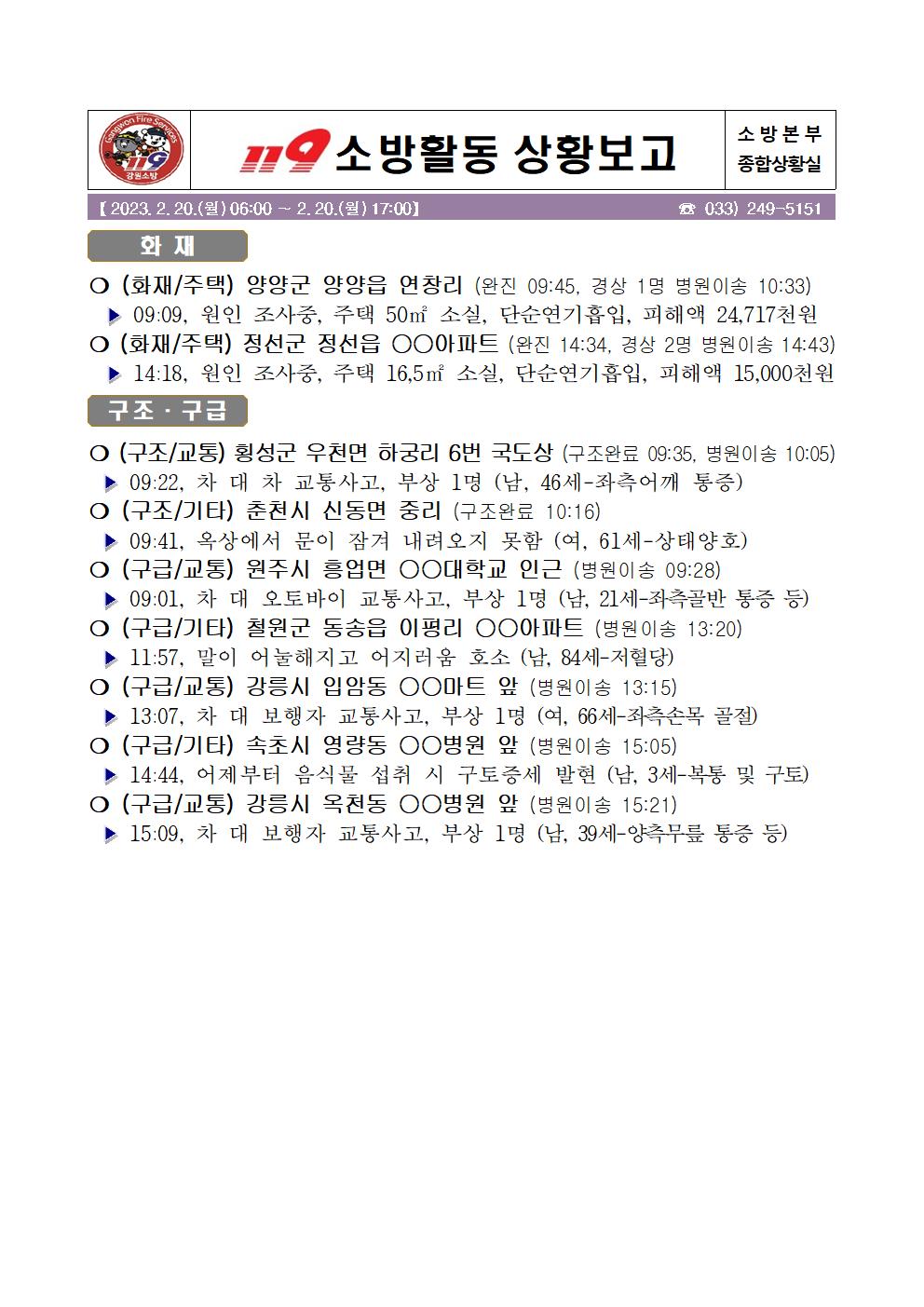 119 소방활동 상황보고(2. 20. 월) 17:00