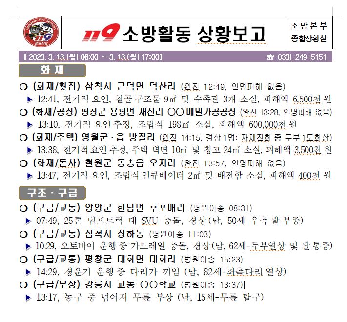 119 소방활동 상황보고(3. 13. 월) 06:00