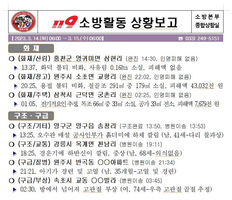 119 소방활동 상황보고(3. 15. 수) 06:00