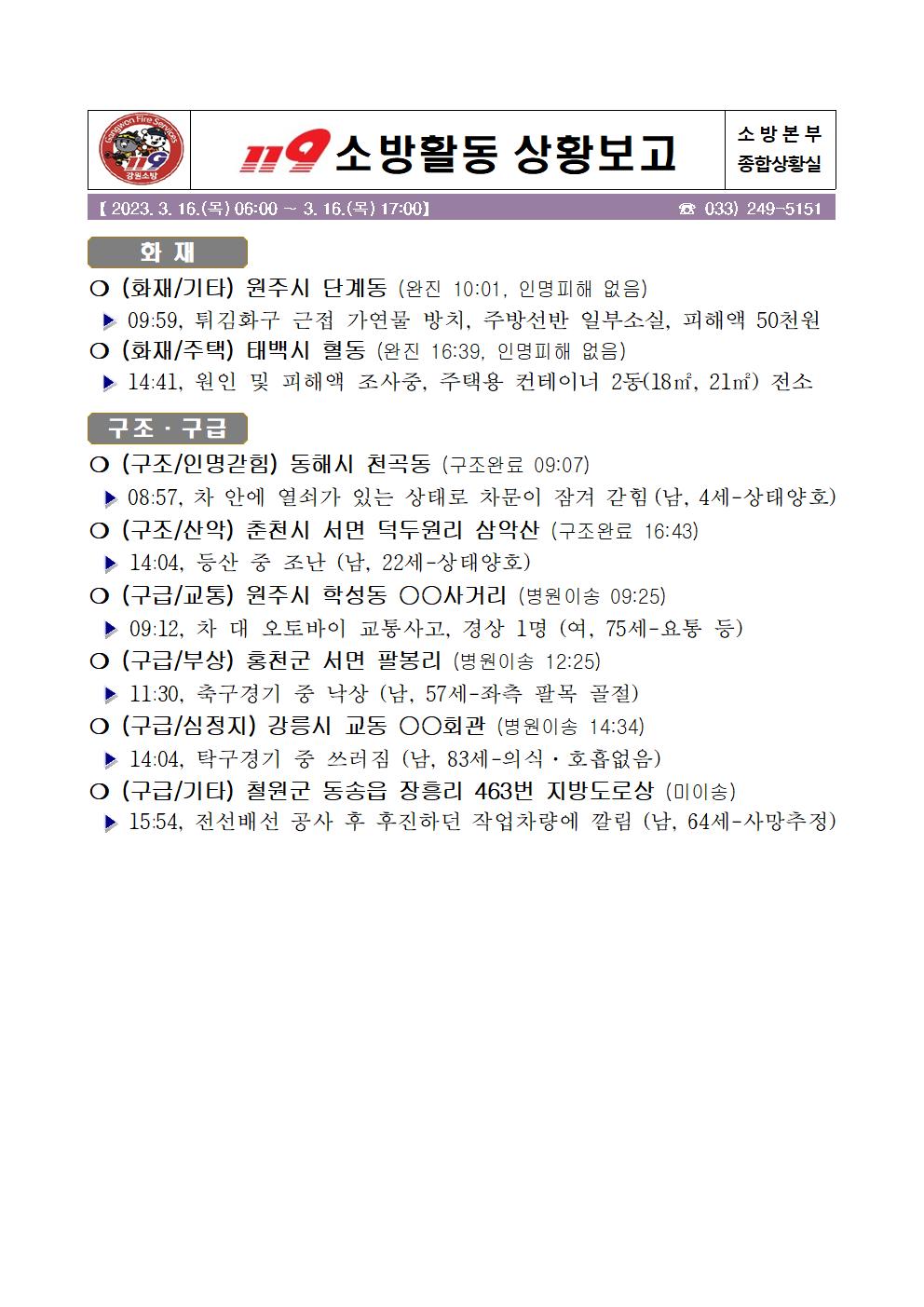 119 소방활동 상황보고(3. 16. 목) 17:00