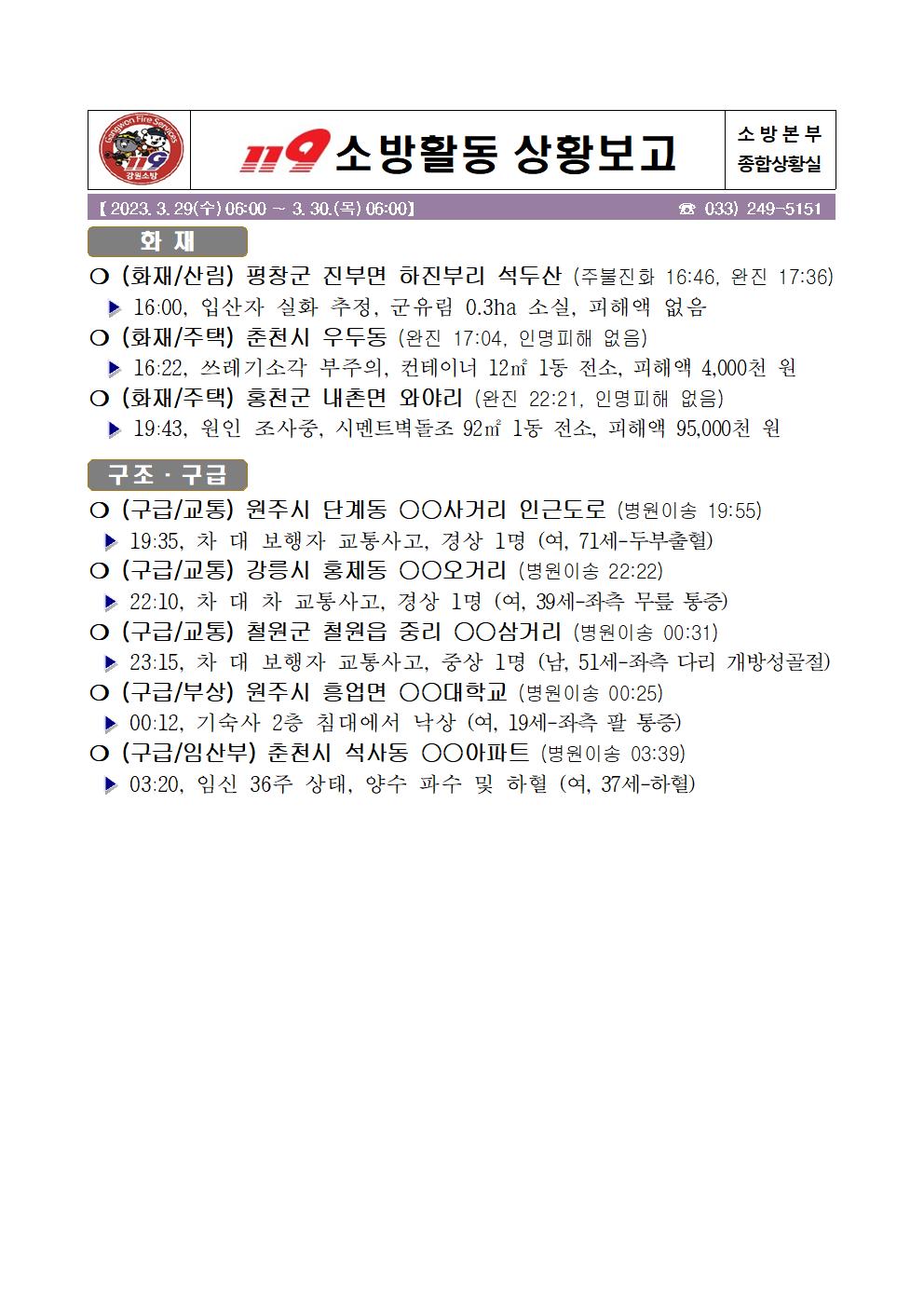 119 소방활동 상황보고(3. 30. 목) 06:00