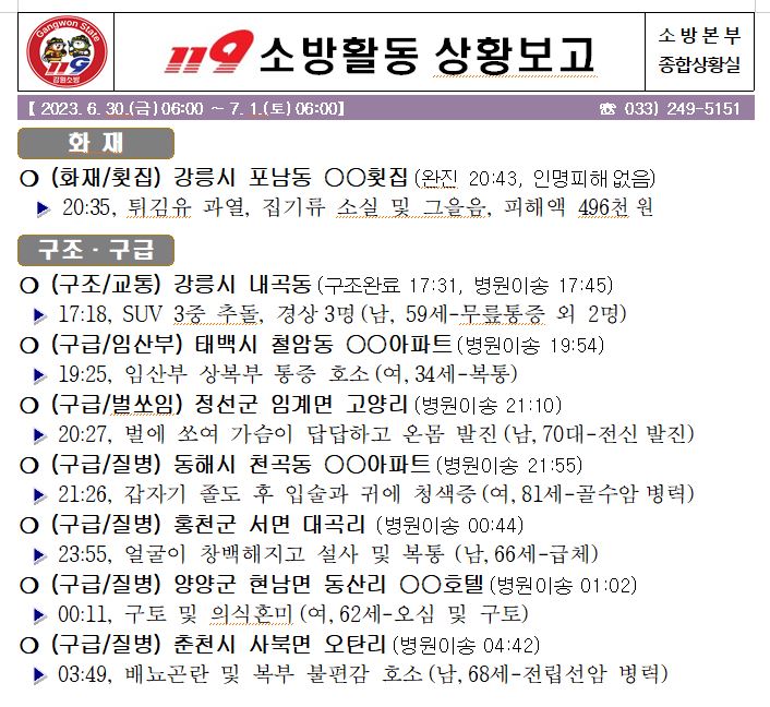 119 소방활동 일일상황보고(7.1.토) 06:00